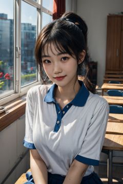 Ultra-high skin detail,Perfect facial details,cinematic lighting,chiaroscuro,super detail,award winning,best quality,FilmGirl,85mm,1girl,18 years old,the abovehalf body,Lolita,Beautiful body,smile,window,standing,upper body,hand on desk,hand on own face,bangs,ponytail,xiaofu,classroom,short sleeves,sitting,desk,blue collar shirt,