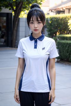 masterpiece,best quality,extremely detailed 8K wallpaper,BANGS,ponytail,1girl,xiaofu,short sleeves,looking at viewer,standing,outdoors,pants,collared shirt,