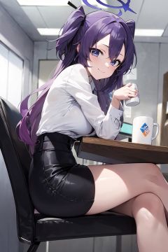 (masterpiece:1.2),best quality,PIXIV,anime,who,1girl, yuuka (blue archive), crossed legs, skirt, solo, shirt, halo, breasts, sitting, long hair, looking at viewer, purple hair, cup, two side up, white shirt, id card, black skirt, thighs, mug, large breasts, holding, chair, indoors, smile, bangs, closed mouth, office lady, long sleeves, miniskirt, purple eyes, blue eyes, pencil skirt, from side, collared shirt, feet out of frame, head rest, holding cup, lanyard, parted bangs, hair ornament, coffee mug