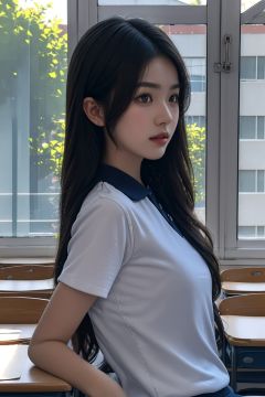 Ultra-high skin detail,Perfect facial details,cinematic lighting,chiaroscuro,super detail,award winning,best quality,1girl,13 years old,Lolita,Beautiful body,long hair,13yo,xiaofu,outdoors,upper body,collared shirt,classroom,sitting,classroom,desk,window,from side,blue_collar,