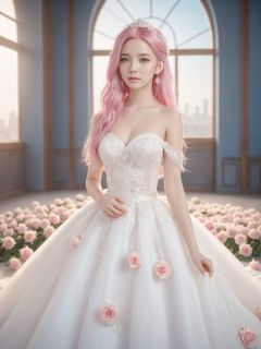 masterpiece, 1 girl, 22 years old, Look at me, Exquisite makeup, Pink hair., Long hair, white wedding dress, Wipe the chest, Indoor, Exquisite decoration, Bright light, Stand, In the middle of the picture, Whole body, Plenty of roses, textured skin, super detail, best quality,Future City,FilmGirl,blue and white porcelain,