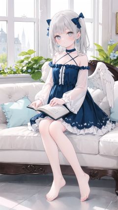 1girl, solo, long hair, wings, feathered wings, book, barefoot, bow, flower, hair bow, sitting, bare shoulders, grey eyes, bangs, very long hair, white wings, blue bow, indoors, strapless, skirt, collarbone, dress, breasts, blue skirt, closed mouth, frills, strapless dress, open book, rain, holding, chair, jewelry, window, couch, earrings, blurry, detached sleeves, grey hair, rose, full body, looking at viewer, blue flower, angel wings