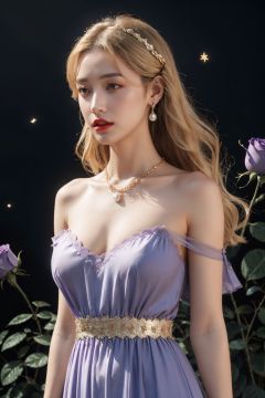 Masterpiece, a girl, off the shoulder, upper body photo, rose, rose, gemstone, glow, pearl, agate, emerald, jade, huge purple rose, huge blue rose, huge rose, rose, purple rose, purple translucent dress, high definition, 32k, Sagittarius, bow and arrow, solo, long hair, looking at the audience, blonde hair, dress, bare shoulders, jewelry, collarbone, upper body, earrings, parted lips, gold costume, necklace, lips, black background, luminous particles, stars, Sagittarius, realistic, red lips, gold