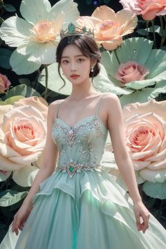 masterpiece, Roses, Roses, Gem, Luminescence, Pearl, Agate, Emerald, Jade stone, princess, Crown, Huge flowers, Flower, Flowers, Flowers, Flowers, Black dress, Medium chest, Lovely, Big eyes, anatomically correct, high details, best quality, HD, 16k