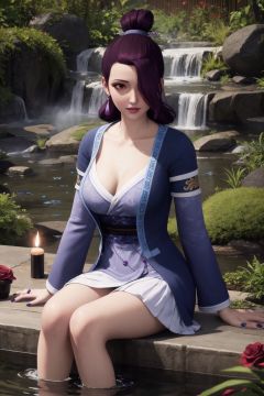 (masterpiece, top quality, best quality, official art, beautiful and aesthetic:1.2), (realistic:1.1), colorful, extreme detailed, highest detailed, RAW, dslr, delicate, sharp focus, (20 years old:1.2), (square-leg:1.2), (slim girl:1.3), (mature female:1.3), (long legs:1.2), (perfect female body:1.1), narrow waist, (large breasts:1.1), ---------------------------------------------------------------------------------------------------------------------------------------------------------------------------------------------------------------------------------------------, arms_behind_back, sitting, outdoors, hot spring, steam rising, rocks and pebbles around spring, sitting in warm water, surrounded by red roses floating in water, petals drifting around body, candles lit nearby, skin glistening with water droplets, sultry and alluring atmosphere, highly detailed sensual scene, cure sunshine, <lora:yanglishi10-000010:0.75:lbw=1,1,1,1,0,0,0.75,0.75,1,1,1,0.6,0.6,1,0.6,0.6,0.6>, yanglishi, 1girl, solo, earrings, jewelry, brown eyes, teeth, nail polish, fingernails, hair over one eye, makeup, realistic, long hair, blue nails, black hair, portrait, purple hair, single hair bun, eyeshadow, hair bun, lips, (blush:1.2), (shiny:1.1), ====================================================================================================================================================, pale skin, white skin, shiny skin, (detailed skin, detailed face:1.1), (emoji ✋:1.3),