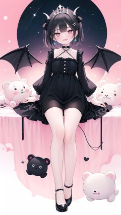 1girl,solo,watercolor,adorable,pink background,smiling,loli,demon girl,red eyes,short hair,black hair,horns,black horns,small wings,black wings,cute dress,frilly dress,black dress,knee-length dress,black and red dress,puff sleeves,round eyes,innocent expression,small fangs,black shoes,Mary Jane shoes,holding a plush toy,teddy bear plush toy,sitting on a cloud,floating,surrounded by stars,moon in the sky,stars in her hair,star-shaped earrings,striped stockings,black and white striped stockings,small tail,black tail,playing with fire,fire in her hands,magical aura,devilish grin,bat-shaped hairclip,tiara,black choker,red ribbon,heart-shaped necklace,mischievous look,small fangs,blush on cheeks,pointy ears,small and delicate hands,fair skin,