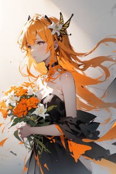 butterfly hair ornament,flat chest,(ambiguous gender:1.2),plain clothes,holding a bouquet of lilies,(from side:0.7),(sketch:1.3),charcoal drawing,rough drawing,selective color monochrome((White, Yellow, Orange)),partial coloring,golden edge,<lora:白夜玫瑰:1>,