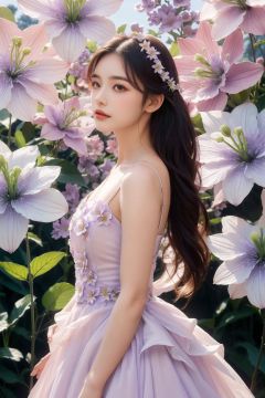 Bestquality, masterpiece, 1girl, beautiful_face, eyebrows_visible_through_hair, lily_\(flower\), dress, holding_flower, from_side, sparkling dress, Giant clove flower, Lilac flower, Lilac flower