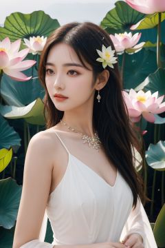 Bestquality, masterpiece, 1girl, beautiful_face, eyebrows_visible_through_hair, lily_\(flower\), dress, holding_flower, from_side, sparkling dress, A giant lotus, Lotus, Lotus, Luminescence, Huge