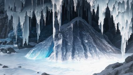 (Ultra Detail:1.2),(Maximum Quality 1.1),(3D Modeling:1.2),(Realistic Landscapes:1.2),((Real World)) in a dark cave with stalactites growing on the top and a lot of ice crystals in different colors on the ground,((Static Angle)))