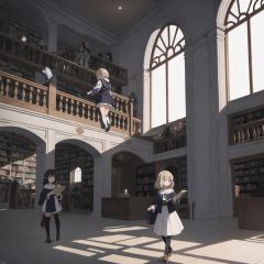 ((ULTRA DETAIL)), ((HIGHEST QUALITY)), ((MASTERPIECE)), Medieval style giant library, sunlight shining through the windows, 1 girl, walking on the stairs of the library, dynamic angle, ((anime ))