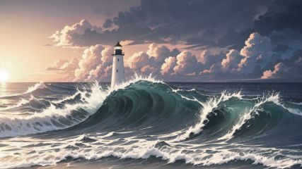 On a stormy night. A lighthouse stands on the vast expanse of sea, and the waves lap at the rocks on the shore.