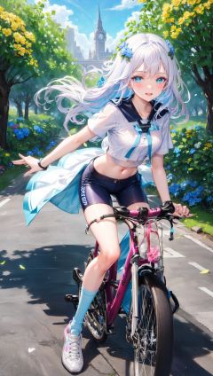 masterpiece, bestquality, highlydetailed, ultra-detailed, hmlacia, leicia, (purple hair:white hair:blue hair:1.125), long hair, hair ornament, ice blue eyes, delicate eyebrows, (solo), 1 girl, bicycle, sunny day, gentle breeze, (flowing hair:1.2), radiant smile, (sparkling eyes:1.3), rosy cheeks, (playful expression:1.1), fashionable outfit, (fitting crop top:1.3), denim shorts, (colorful sneakers:1.2), (dainty accessories:1.1), (flower crown:1.2), (frilly socks:1.1), (glowing skin:1.3), (natural makeup:1.1), (cheerful pink blush:1.2), (glossy lips:1.1), (carefree attitude:1.2), (scenic route:1.3), (blooming flowers:1.4), (green meadows:1.2), (blue sky:1.3), (joyful laughter:1.1), (bicycle basket:1.2), (streaming ribbons:1.3), (carefree spirit:1.1), (bicycle bell:1.2), (adventurous journey:1.3), (exploring the city:1.4), (positive energy:1.2), (enjoying the freedom:1.1)