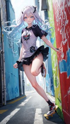 masterpiece, bestquality, highlydetailed, ultra-detailed, hmlacia, leicia, (purple hair:white hair:blue hair:1.125), long hair, hair ornament, ice blue eyes, delicate eyebrows, (solo),1 girl, edgy, cool, skateboarder, rebellious, confident, determined, long hair in the wind, intense gaze, daring smile, urban style, streetwear, skater girl, performing tricks, fearless, ********** rush, skateboarding, dynamic pose, urban setting, graffiti backdrop, bold, independent, adventurous, urban vibe, high energy, skilled, gritty, urban chic