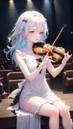 masterpiece, bestquality, highlydetailed, ultra-detailed, hmlacia, leicia, (purple hair:white hair:blue hair:1.125), long hair, hair ornament, ice blue eyes, delicate eyebrows, (solo), 1 girl, (music room background), (elegant dress:1.2), (sitting pose), (violin), (focused expression:0.9), (music stand), (bow movement), (soft lighting), (sheet music), (warm colors), (ambient lighting), (wooden floor), (melodious), (intense gaze), (beautiful melody), (flowing hair), (music lover),  (concert hall), (graceful posture), (classic elegance), (musical expression)