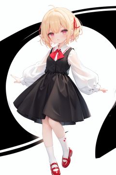 1girl, rumia, blonde hair, solo, white background, red eyes, red footwear, simple background, ascot, short hair, ribbon, open mouth, hair ribbon, smile, long sleeves, shirt, looking at viewer, red ascot, white socks, white shirt, red ribbon, shoes, socks, frills, bangs, outstretched arms, hair between eyes, skirt, :d, dress, vest, mary janes, black dress, black skirt, collared shirt, black vest, blush