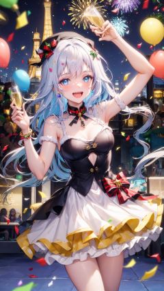 masterpiece, bestquality, highlydetailed, ultra-detailed, hmlacia, leicia, (purple hair:white hair:blue hair:1.125), long hair, hair ornament, ice blue eyes, delicate eyebrows, (solo), 1 girl, (festive atmosphere), (party), (sparkling decorations), (confetti), (glittering lights), (fireworks), (countdown), (festive hat), (party dress), (shimmering outfit), (dancing), (laughing), (cheering), (toasting), (champagne), (celebratory atmosphere), (joyful smiles), (excitement), (new beginnings), (hopeful wishes), (balloons), (streamers), (glamorous makeup), (festive accessories), (dazzling jewelry), (Eiffel Tower), (Times Square), (city skyline), (crowd), (festive crowd), (live music), (dance floor), (sparkling champagne glass), (reflection), (celebratory spirit), (unforgettable night), (positive energy), (optimistic vibes), (joyful anticipation)