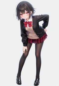 1girl, solo, pantyhose, skirt, long hair, loafers, shoes, simple background, school uniform, brown eyes, plaid, black pantyhose, plaid skirt, looking at viewer, black hair, pantyhose pull, full body, clothes pull, black footwear, pleated skirt, leaning forward, bangs, long sleeves, bent over, cardigan, bow, bowtie, standing, closed mouth, pulled by self, grey background, blush, miniskirt, red bow, sweater, **********