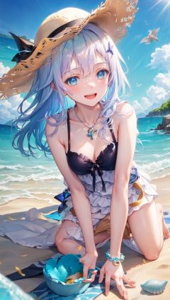 masterpiece, bestquality, highlydetailed, ultra-detailed, hmlacia, leicia, (purple hair:white hair:blue hair:1.125), long hair, hair ornament, ice blue eyes, delicate eyebrows, (solo:1.2), 1 girl, beach, seashells, sandy shore, (sunny day), (clear blue sky), (gentle ocean waves), (seagulls flying), (sparkling water), (sea breeze), (playful dolphins in the distance), (relaxed atmosphere), (seashell collection), (sun hat), (flowy sundress), (barefoot), (smiling), (curious expression), (excited gestures), (bending down), (examining seashells), (bucket in hand), (colorful seashells), (shell patterns), (variety of shapes and sizes), (tidal pools), (footprints in the sand), (seaglass), (beach umbrella), (beach towel), (seashell necklace), (seashell bracelets), (joyful moment), (treasure hunting), (gentle sound of waves), (warmth of sunlight), (soft sand beneath feet), (peaceful seashore sounds), (relaxing rhythm of tides), (whispering breeze), (calming ocean horizon), (serene and soothing ambiance), (mindfulness and tranquility),