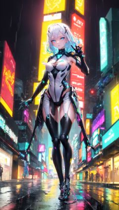masterpiece, bestquality, highlydetailed, ultra-detailed, hmlacia, leicia, (purple hair:white hair:blue hair:1.125), long hair, hair ornament, ice blue eyes, delicate eyebrows, (solo:1.2), 1 girl cyberpunk city, rainy night, neon lights, futuristic atmosphere, (rain-soaked streets:1.2), (glistening pavement:1.1), fashionable lady, (glowing neon hair:1.3), (vibrant colors:1.2), (edgy hairstyle:1.1), (futuristic fashion:1.3), (eye-catching outfit:1.2), (high-tech accessories:1.1), (reflective surfaces:1.2), (shimmering makeup:1.3), (confident expression:1.2), (urban backdrop:1.1), (dynamic pose:1.3), (raindrops:1.2), (sleek architecture:1.1), (cybernetic enhancements:1.2),  (holographic displays:1.3), (electric atmosphere:1.2), (raincoat:1.1), (techno-gloves:1.2), (city glow:1.3), (synthetic materials:1.2), (rainy ambiance:1.1), (neon reflections:1.2), (urban nightlife:1.3), (cyberpunk vibes:1.2), (enhanced visibility:1.1), (futuristic transportation:1.2), (electric energy:1.3), (dystopian undertones:1.2), (rain-soaked glamour:1.4), (bold fashion statement:1.3), (dynamic lighting:1.2)