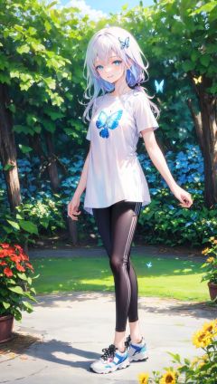 masterpiece, bestquality, highlydetailed, ultra-detailed, hmlacia, leicia, (purple hair:white hair:blue hair:1.125), long hair, hair ornament, ice blue eyes, delicate eyebrows, (solo:1.2), 1 girl, t-shirt, leggings, casual style, comfortable, relaxed, (white t-shirt:1.2), (black leggings:1.1), (sneakers:1.2), (loose-fit t-shirt:1.1), (casual hairstyle:1.1), (minimal makeup:0.8), (natural beauty:1.2), (smiling expression:1.1), (standing pose:1.2),(green park:0.9), (shady trees), (sunny day), (gentle breeze:1.1),  (colorful flowers:0.8), (playful butterflies), (picnic blanket), (relaxing outdoor setting), (peaceful ambiance:1.1), (carefree vibe:1.2), (enjoying nature:1.1),  (serene mood:1.1).