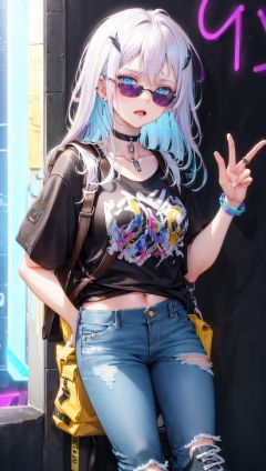 masterpiece, bestquality, highlydetailed, ultra-detailed, hmlacia, leicia, (purple hair:white hair:blue hair:1.125), long hair, hair ornament, ice blue eyes, delicate eyebrows, (solo:1.2),1 girl, trendy, fashionable, stylish, modern, urban, (hipster:1.2), (edgy:1.3), (piercings:1.2), (oversized sunglasses:1.3), (graphic t-shirt:1.2), (ripped jeans:1.2), (sneakers:1.1), (chunky sneakers:1.3), (statement accessories:1.2), (choker necklace:1.1), (trendy backpack:1.2), (temporary tattoos:0.9), (neon lights background:1.4), (urban graffiti:1.3), (street art:1.2), (cityscape:1.1), (vibrant colors:1.2), energetic, confident, (selfie pose:1.1), (playful expression:1.2), (street style:1.3), (fashion icon:1.5), (photogenic:1.2)