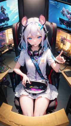masterpiece, bestquality, highlydetailed, ultra-detailed, hmlacia, leicia, (purple hair:white hair:blue hair:1.125), long hair, hair ornament, ice blue eyes, delicate eyebrows, (solo:1.2),1 girl, gamer, focused expression, sitting on a comfortable gaming chair, (gaming headset), intense gameplay, (console controller:1.2), (LED-lit gaming keyboard:1.1), (gaming mouse:1.1), (gaming monitor:1.2), (RGB lighting:0.9), immersive gaming setup, gaming posters on the wall, shelves filled with video game cases, (gaming figurines:0.8), (gaming merchandise:1.1), (energy drink:0.7), (snacks:0.8), headphones on, (virtual reality headset:1.3), (competitive esports:1.4),