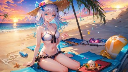 masterpiece, bestquality, highlydetailed, ultra-detailed, hmlacia, leicia, (purple hair:white hair:blue hair:1.125), long hair, hair ornament, ice blue eyes, delicate eyebrows, (solo:1.2),1 girl, beachgoer, sunny and vibrant beach, sandy shoreline, (sun hat:1.1), (sunglasses:1.1), (beach umbrella:1.2), (beach towel:1.1), (sunscreen:0.9), (swimsuit:1.2), (flip flops:1.1), (beach toys:1.2), building sandcastles, (seashells:0.8), (beach ball:1.1), (inflatable float:1.2), (smoothie:0.9), (ice cream:1.1),  (tropical drink:0.8), (seagulls:0.7), (waves:1.2), (sailing boats:0.9), (palm trees:1.1), (seashore:0.9), (seaweed:0.8), (sand dunes:1.2), (sand footprints:0.9), (seashore sunset:1.3), (sparkling ocean:1.2), (seaglass jewelry:1.1)
