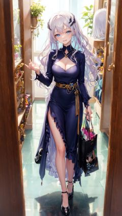 masterpiece,bestquality,highlydetailed,ultra-detailed,highres,hmlacia,leicia,(purple hair:white hair:blue hair:1.025),long hair,(long wavy hair:1.2),hair ornament,ice blue eyes,delicate eyebrows,solo,1 girl,browsing,high heels,shoe store,fashionable,trendy,diverse,colorful,(sparkling:1.2),(variety of designs:1.3),(shoe racks:1.1),(reflection on the floor:0.9),(large mirror:1.2),(display window:1.1),(decorative plants:0.8),(soft lighting:1.2),(stylish outfits:1.2),(dressing room:0.9),(fitting different pairs:1.1),(confident:1.1),(outdoor street view:0.7),(shopping bags:1.1),(price tags:0.9),(fashionable accessories:1.1),(trying on:1.2),(pleased expression:1.2),(Close-up:1.2),