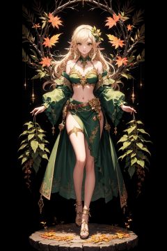 (masterpiece,top quality,best quality,official art,beautiful and aesthetic:1.2),(1elf),(full body:1.3),extreme detailed,(fractal art:1.3),colorful,break,highest detailed,Green,break,Brown,break,Yellow,break,Chest,Abdomen,Leaves swaying in the breeze,(whole body:1.5), WaHaa