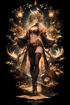 (masterpiece,top quality,best quality,official art,beautiful and aesthetic:1.2),(1elf),(full body:1.3),extreme detailed,(fractal art:1.3),colorful,break,highest detailed,Green,break,Brown,break,Yellow,break,Chest,Abdomen,Leaves swaying in the breeze,(whole body:1.5), WaHaa