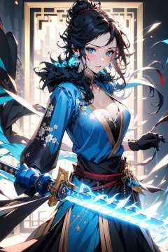(masterpiece:1.2),best quality,Chinese style,1girl,breasts,weapon,sword,solo,blue eyes,cleavage,holding sword,black hair,holding weapon,holding,katana,sheath,single hair bun,unsheathing,jewelry,hair bun,earrings,gloves,blue gloves,fur trim,holding sheath,closed mouth,large breasts,blush,fighting stance,medium breasts,long hair,from side,bangs,