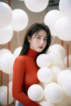 breathtaking cinematic film still, Cowboy_Shot, blouse ,, a cinematic fashion portrait photo of beautiful young woman from the 90s wearing a red turtleneck standing in the middle of a ton of white balloons, dramatic lighting, taken on a hasselblad medium format camera, looks like liuyifei, white balloon, shallow depth of field, vignette, highly detailed, high budget, bokeh, cinemascope, moody, epic, gorgeous, film grain, grainy . award-winning, professional, highly detailed,sc,monkren,wlop