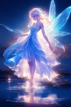 a woman in a white dress is standing in the water, an anime drawing by Yuumei, pixiv contest winner, fantasy art, glowing angelic being, astral fairy, beautiful fairy, beautiful angel, water fairy, ethereal wings, ethereal angelic being of light, beautiful fairie, ethereal!!!!!!!, of beautiful angel, ethereal essence, ethereal!!!