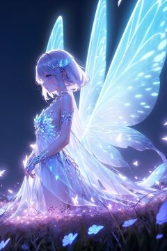 anime girl with glowing wings in a field of flowers, digital art by Yuumei, pixiv contest winner, fantasy art, big white glowing wings, astral fairy, neon wings, wings made of light, beautiful fairy, glowing butterflies, glowing angelic being, beautiful fairies, fairies have wings, ethereal wings, beautiful digital art, beautiful digital artwork, neon light and fantasy