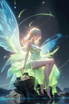 a woman sitting on a rock in the water with a green fairy dress, astral fairy, water fairy, glowing angelic being, beautiful fairy, glowing aura around her, ethereal wings, beautiful fantasy art, very beautiful fantasy art, beautiful fairies, neon wings, ethereal aurora spirits, very beautiful digital art, beautiful digital art, elven angel meditating in space