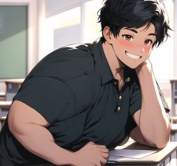 1boy,black hair,brown eyes,(fatty:1.2),high definition,grinning,school_desk,classroom,rotor,(private talk:1.2),short hair,school_uniform,fat,round-headed and round-brained,senior high school student,