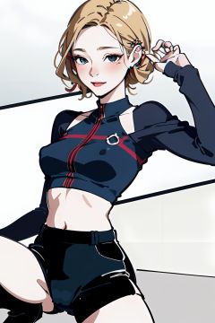 (((((ultra realistic:1.3)), (best quality:1.3, high quality:1.3), 8K Ultra HD, (ultra detailed, hyper detailed), ray tracing:0.5, (good anatomy:1.2), surdres:1.2, masterpiece, intricate details, (((wide_shot:1.3, distance view:1.3))), (makeup:0.7, sexy, best body), 1girl, solo, small head, highres, detailed skin, cameltoe:0.3, covered nipple:0.07, instagram style, small hands, woman hand, nice hand, withdrawn face))),BREAK((Faux Hawk Updo with Hair Rings, Medium Dark Red color hair, Golden Blonde color eyes, Overjoyed, Blush, smokey eyeliner, Size B breasts, buff body)), Kneeling with one hand reaching upwards,BREAKTailored Skirt, ankle socks, heeled pumps, looking up,BREAKCanaima in Venezuela, from behind, (uppe body),BREAKsunset, Cool and breezy,