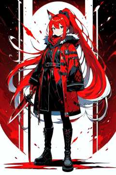 xsty,<lora:XSTY-CO:0.7>,best,8k,uhd,masterpiece,bright,high quality,ultra-wide angle,solo,video game cover,(very long hair:1.4641),(full body:1.331),(red hair:1.4641),(holding sword:1.21),black eyes,(black coat other white robe:1.21),tiny breasts,fire sword,(boots:1.1),(best light:1.1),bloodboom in n background,weapon cards,hand101,omertosa,default,flames,((chop):1.331),(speed lines:1.21),absurdres,red theme,high contrast,close-up,great soldier,medium breasts,(ponytail:1.21),Fur collar,Fox scarf,(red robe),blood in n background,midjourney portrait,fox in background,