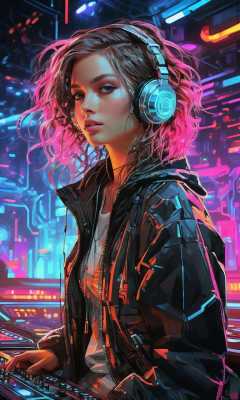 xsgb,<lora:xsgb:1>,Portrait,1girl,Full-body shot,Dynamic,(Cybernetic DJ),(Mixing music in a futuristic club:1.2),(Glowing neon lights:1.1),a dynamic portrait of a cybernetic DJ mixing music in a futuristic club with glowing neon lights,(Holographic turntables),(Crowd dancing in the background),(Energetic atmosphere:1.3),capturing the energy of a futuristic nightlife.,