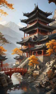 xsgb,<lora:xsgb:1>,((masterpiece)),((best quality)),8k,high detailed,ultra-detailed,intricate detail,Mountain,Wood,Water,Chinese Architecture,sun,