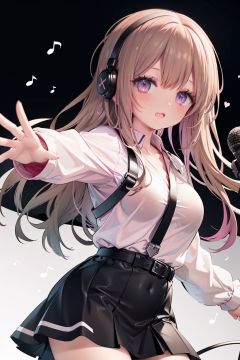 1girl, solo, microphone, smile, skirt, blush, brown eyes, long hair, open mouth, looking at viewer, brown hair, long sleeves, :d, shirt, bangs, belt, breasts, pink shirt, outstretched arm, music, black belt, medium breasts, holding microphone, singing
