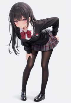 1girl, solo, pantyhose, skirt, long hair, loafers, shoes, simple background, school uniform, brown eyes, plaid, black pantyhose, plaid skirt, looking at viewer, black hair, pantyhose pull, full body, clothes pull, black footwear, pleated skirt, leaning forward, bangs, long sleeves, bent over, cardigan, bow, bowtie, standing, closed mouth, pulled by self, grey background, blush, miniskirt, red bow, sweater, **********