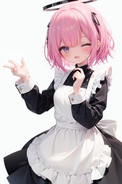 1girl, solo, apron, halo, hair over one eye, closed eyes, smile, white background, dress, white apron, simple background, long sleeves, multicolored hair, braid, open mouth, blue hair, alternate costume, blush, bangs, :d, pink hair, black dress, ribbon, frilled dress, enmaided, short hair, hand up, colored inner hair