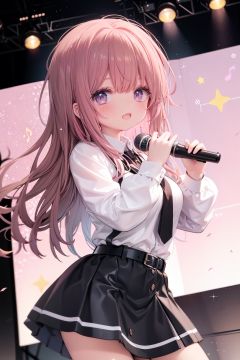 1girl, solo, microphone, smile, skirt, blush, brown eyes, long hair, open mouth, looking at viewer, brown hair, long sleeves, :d, shirt, bangs, belt, breasts, pink shirt, outstretched arm, music, black belt, medium breasts, holding microphone, singing