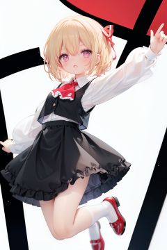 1girl, rumia, blonde hair, solo, white background, red eyes, red footwear, simple background, ascot, short hair, ribbon, open mouth, hair ribbon, smile, long sleeves, shirt, looking at viewer, red ascot, white socks, white shirt, red ribbon, shoes, socks, frills, bangs, outstretched arms, hair between eyes, skirt, :d, dress, vest, mary janes, black dress, black skirt, collared shirt, black vest, blush