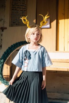 masterpiece, best quality,8K,realistic, High definition, photography, depth of field,HDR, highres,(photoshop \(medium\):1.2) , <lora:KitchoYachie:1>,outdoors,cowboy shot, kicchou yachie,1girl, (dragon horns:1.2),blonde hair, short hair,red eyes,ribbon,short sleeves,blue shirt,blue skirt,turtle shell, dragon tail,dragon girl, pleated skirt,