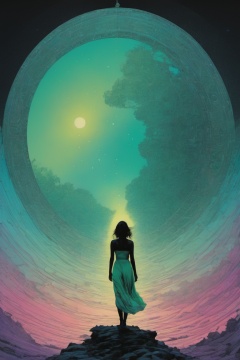 pefect white balance, Step into a realm where innocence gives way to an otherworldly transformation. A beautiful woman's silhouette takes center stage against the astral cosmic sky, thanks to a mesmerizing double exposure effect. The collaborative genius of artists like Brandon Kidwell, Andreas Lie, and Dan Mountford brings this dreamlike scene to fruition. This oil and ink canvas masterpiece boasts fine art elements and super dramatic lighting that create astonishing depth. The photoillustration technique breathes life into the concept of evolution, as glowing particles and intricate details guide your gaze. Iridescent shades of green and pink cast a hypnotic spell over the hyperdetailed, vibrant scenery, making it a mesmerizing and surreal experience.,