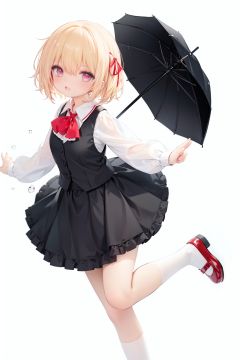 1girl, rumia, blonde hair, solo, white background, red eyes, red footwear, simple background, ascot, short hair, ribbon, open mouth, hair ribbon, smile, long sleeves, shirt, looking at viewer, red ascot, white socks, white shirt, red ribbon, shoes, socks, frills, bangs, outstretched arms, hair between eyes, skirt, :d, dress, vest, mary janes, black dress, black skirt, collared shirt, black vest, blush
