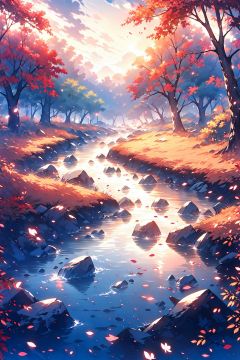 A ultra-realistic CG rendering of Ancient China,There is a stream, jiangnan ancient buildings on besides of the stream,in the evening,Red leaf maple tree, a moon in the sky,tianyuan,CUXIAN,cg3d